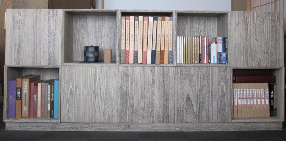 応接室に設置された本棚は、桐の柔らかい素材感が空間を満たし、来客者を優しく迎える演出にもなっている。